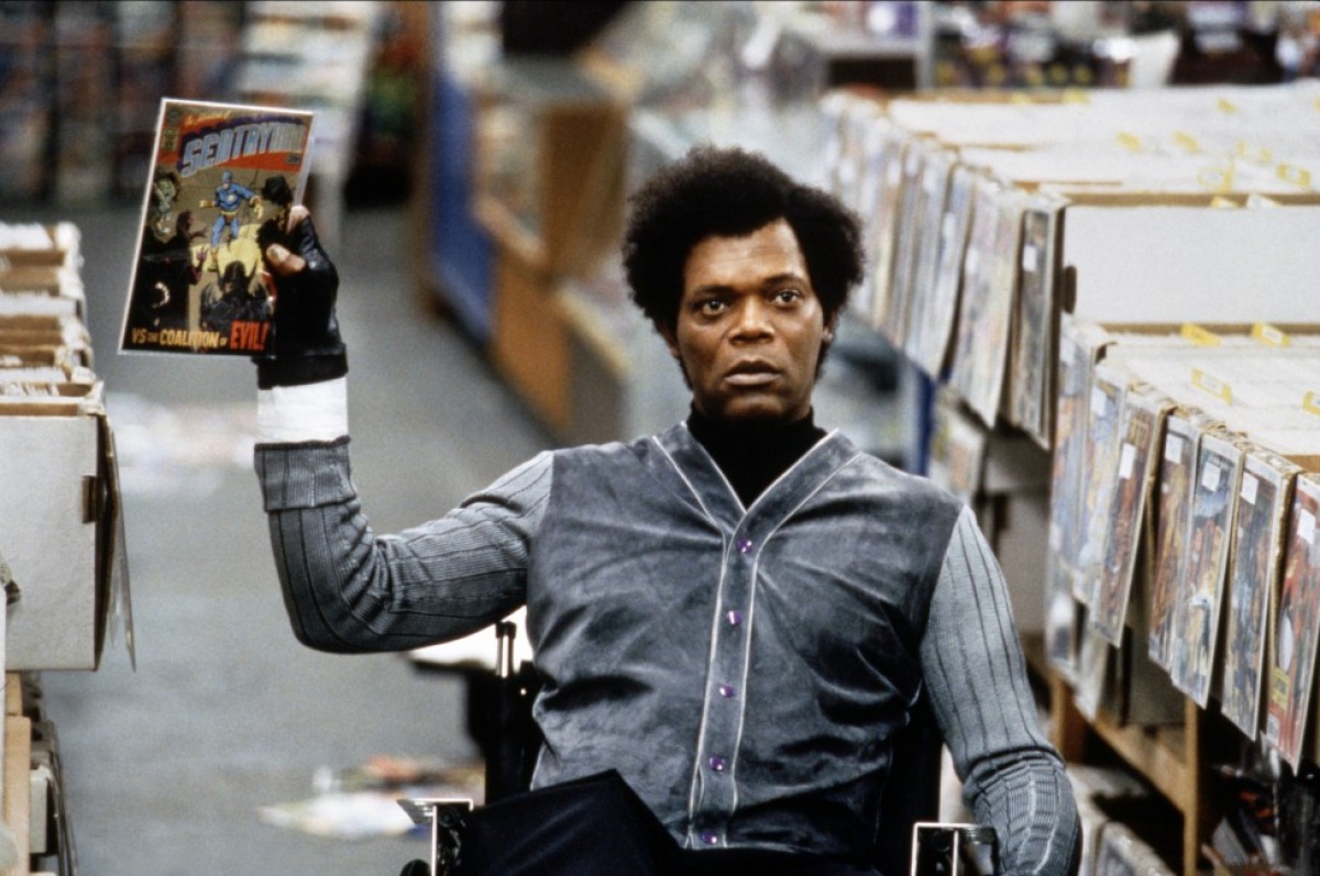 Elijah Price souffre d’une forme particulière d’ostéogénèse (Wikipédia pour les Nuls) : au moindre choc, ses os tombent en miette. Sombre maladie génétique, qui pousse ce cher Samuel L. Jackson, à vénérer des personnages aux antipodes de sa condition : les super héros de comics. Tenancier d’une librairie spécialisée en la matière, il voue son existence à la recherche de personnes hors du commun.
